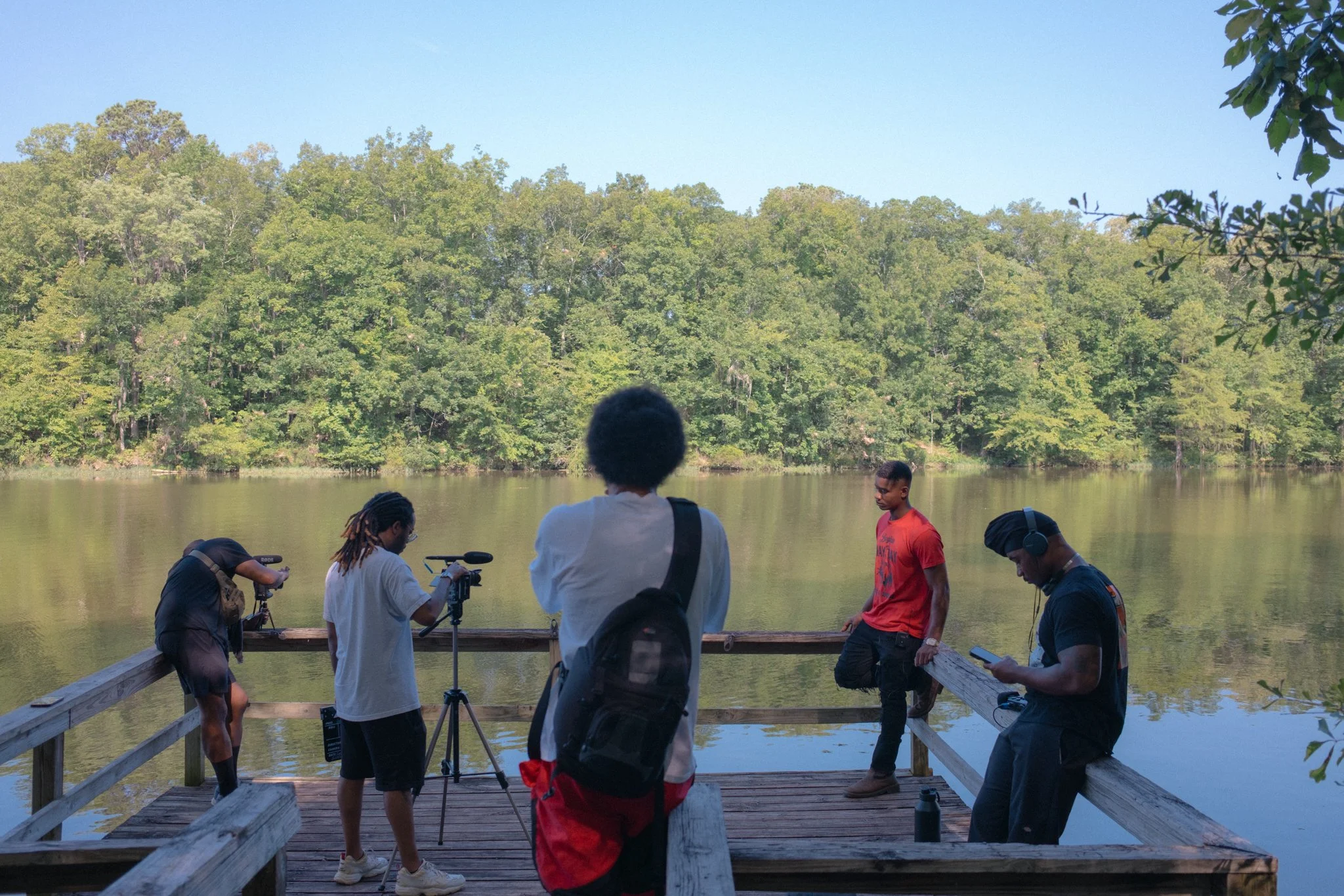 Behind-the-scenes of Gee’s Bend: Welcome to the Hole, as the crew films an interview on a quiet riverside dock. Surrounded by lush greenery, the scene captures the collaborative spirit and intentionality driving this documentary on Black history, art, and resistance.